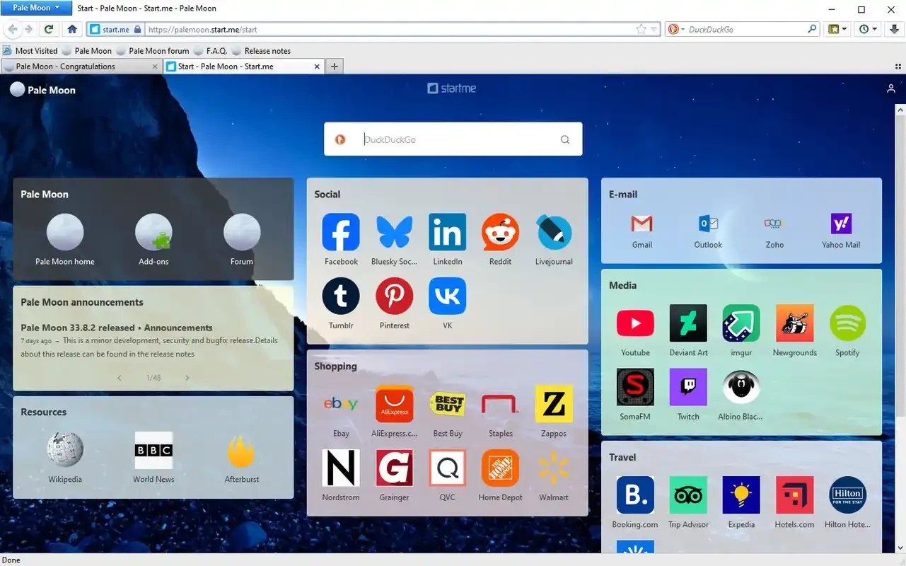 Pale Moon to najlepsze połączenie personalizacji, stabilności i szybkości, którego motto brzmi „Twoja przeglądarka, Twoja droga”. Została stworzona jako fork Mozilli Firefox i oferuje wiele starannie dobranych funkcji i optymalizacji , ale główną różnicą jest użyteczność trybu – Firefox działa w trybie wieloprocesowym, a Pale Moon w jednoprocesowym. Teraz korzysta z silnika przeglądarki Goanna i oferuje konfigurowalną stronę startową dzięki współpracy z start.me. Domyślnym silnikiem jest DuckDuckGo, zamiast Google lub Yahoo. Podobnie, korzysta z usługi IP-API, zamiast mechanizmów geolokalizacji Google.